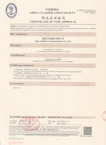 - 鑫諾衛星通信有限公司自主研發網關產品獲中國船級社型式認可證書